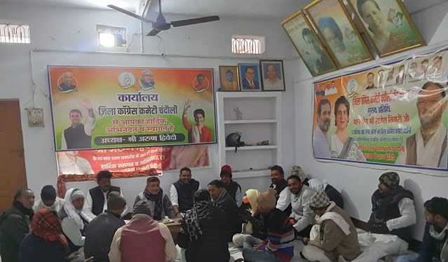 चंदौली। जिला कांग्रेस कमेटी चंदौली की एक अहम बैठक बुधवार को जिला कांग्रेस कार्यालय चंद्रा त्रिपाठी कांग्रेस भवन में आयोजित की गई। बैठक की अध्यक्षता जिला अध्यक्ष अरुण द्विवेदी ने की। बैठक में प्रदेश और केंद्र सरकार की नीतियों पर तीखा हमला बोलते हुए कांग्रेस नेताओं ने जिले समेत पूरे प्रदेश में कानून व्यवस्था को फेल बताया।