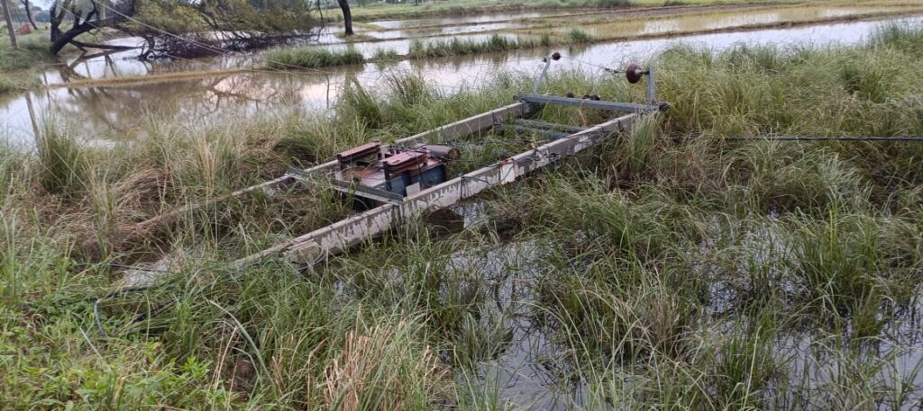 - पानी घटने पर खंभा और ट्रांसफार्मर जमीन पर गिर गए।